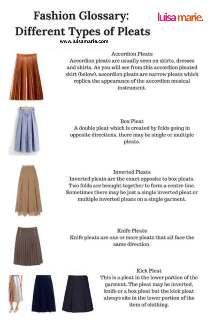 What are the different types of pleats? This is a fashion glossary listing all of the different types of pleats that you need to know about in order to understand pleat names, styles and appearances.